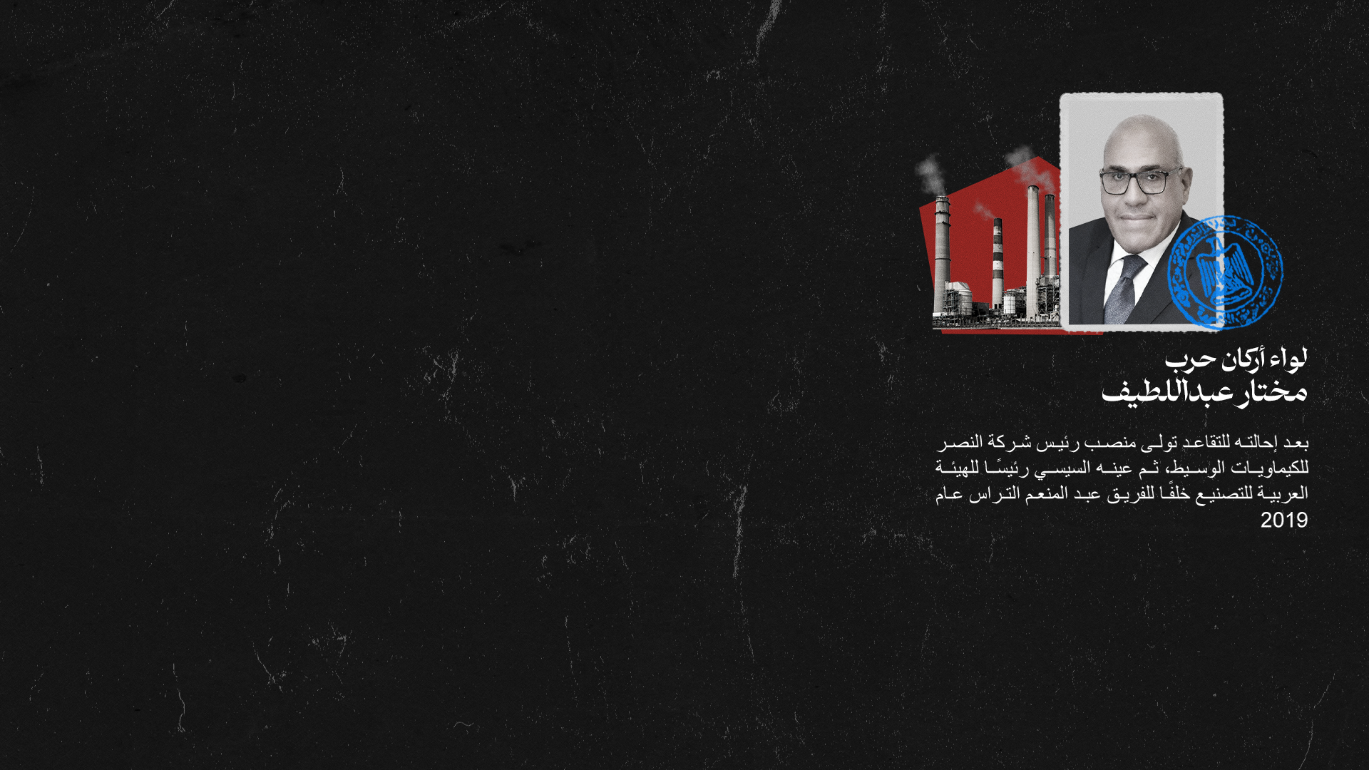 عينه السيسي بعد تقاعده رئيسا لمجلس إدارة شركة النصر للكيماويات الوسيط التابعة لجهاز مشروعات الخدمة الوطنية